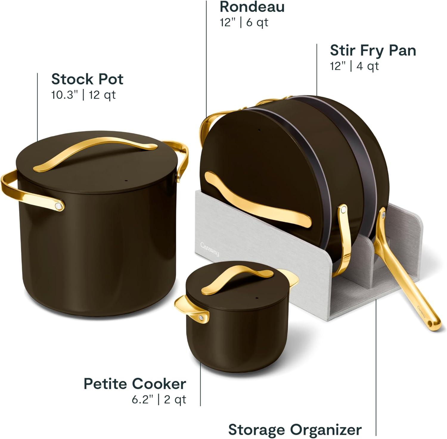Caraway Cookware+ Collection – Specialty Cookware Set – Petite Cooker, Stir Fry Pan, Rondeau, & Stock Pot – 3 Lids & Storage Organizer Included – Cream(Black)