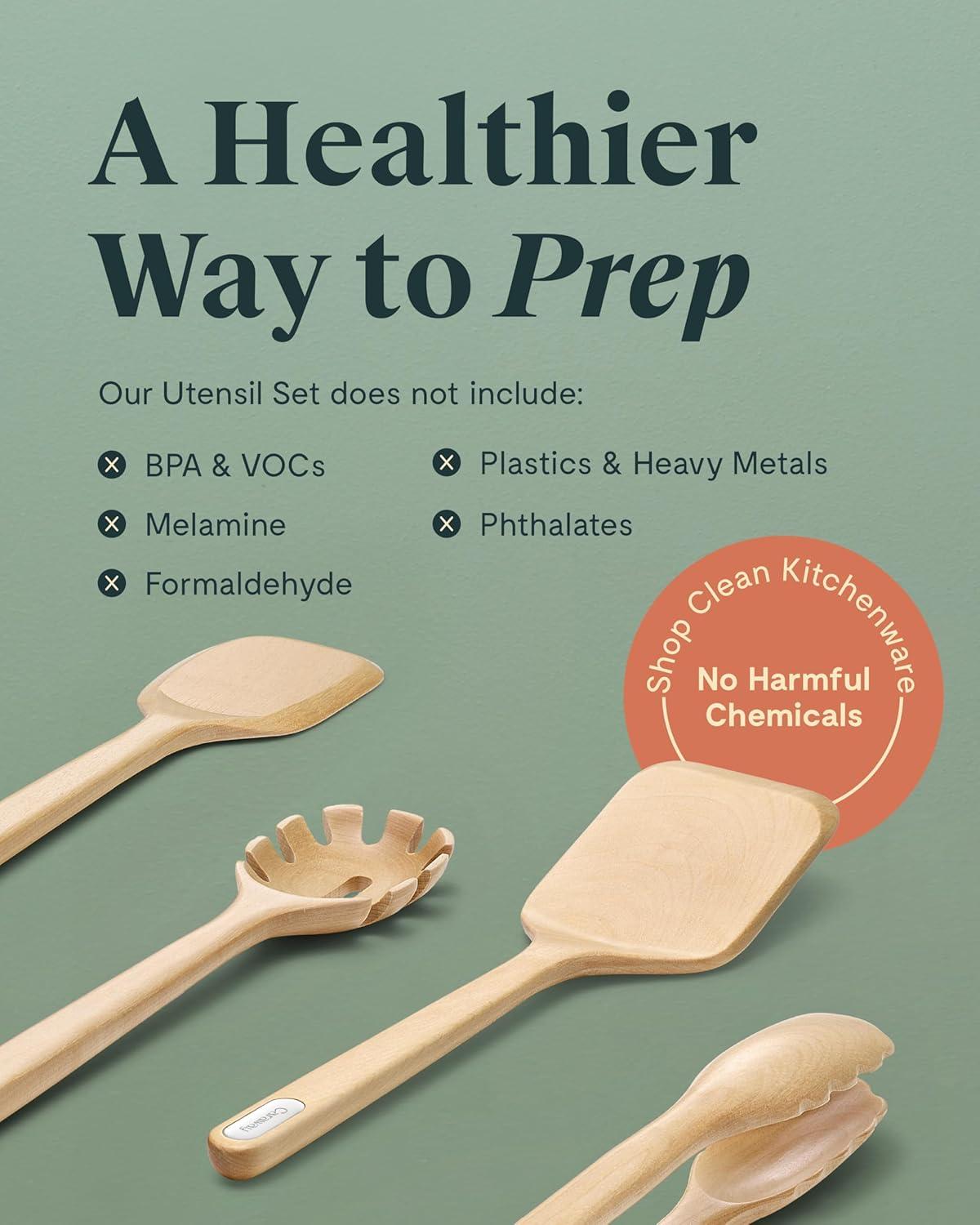 Caraway Wooden Utensil Set – 5 Piece Cooking Utensil Set – Spoon, Server, Scraper, Spatula, & Tongs – Made From FSC-Certified Birch Wood – No Microplastics