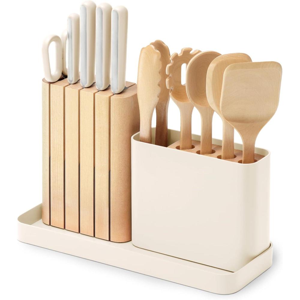 Caraway 14-Piece Kitchen Prep Set – Kitchen Knife Set & Wooden Utensil Set – Made With Premium German Steel Blades & FSC-Certified Birch Wood – Non-Toxic Materials – Includes Organizer – Cream(Cream)
