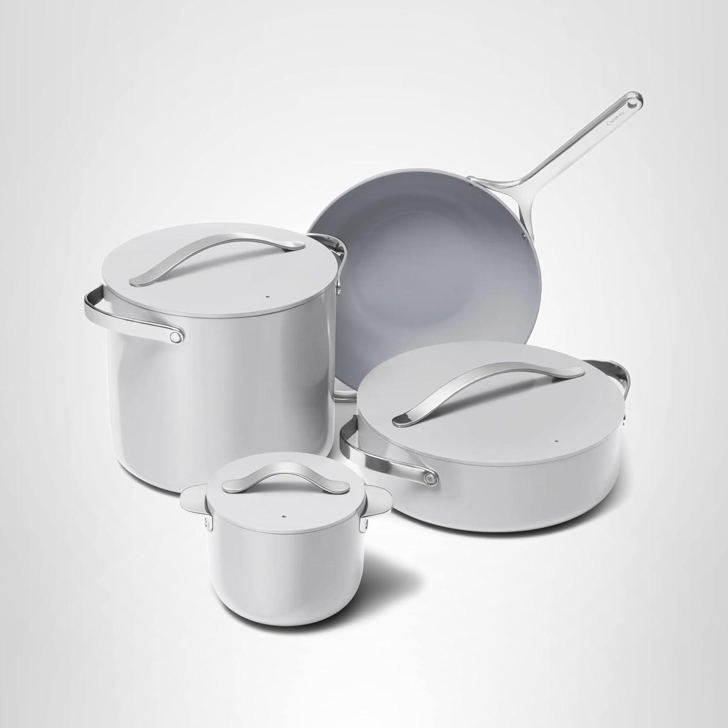 Caraway Cookware+ Collection – Specialty Cookware Set – Petite Cooker, Stir Fry Pan, Rondeau, & Stock Pot – 3 Lids & Storage Organizer Included – Cream(Gray)