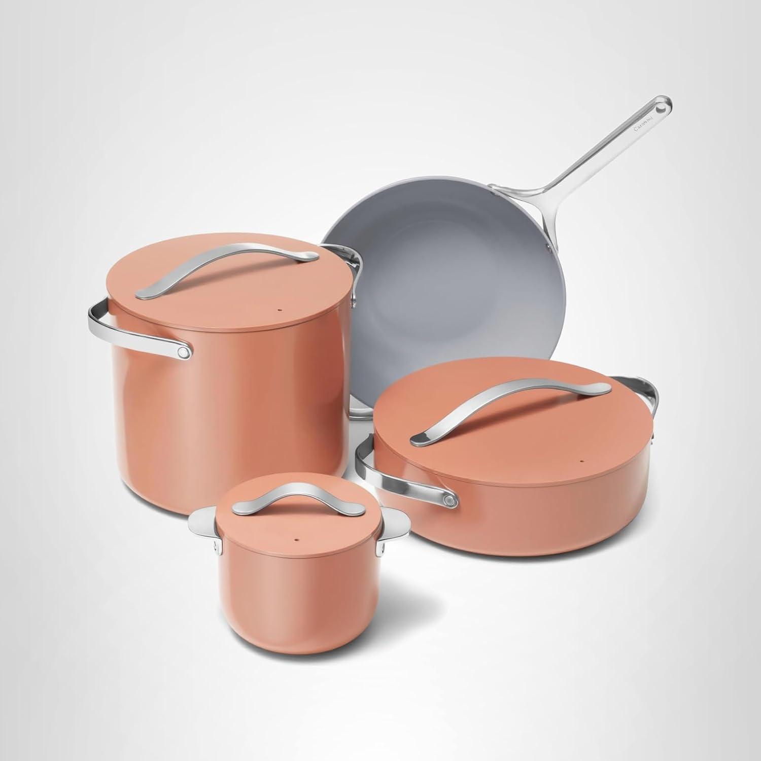 Caraway Cookware+ Collection – Specialty Cookware Set – Petite Cooker, Stir Fry Pan, Rondeau, & Stock Pot – 3 Lids & Storage Organizer Included – Cream(Perracotta)