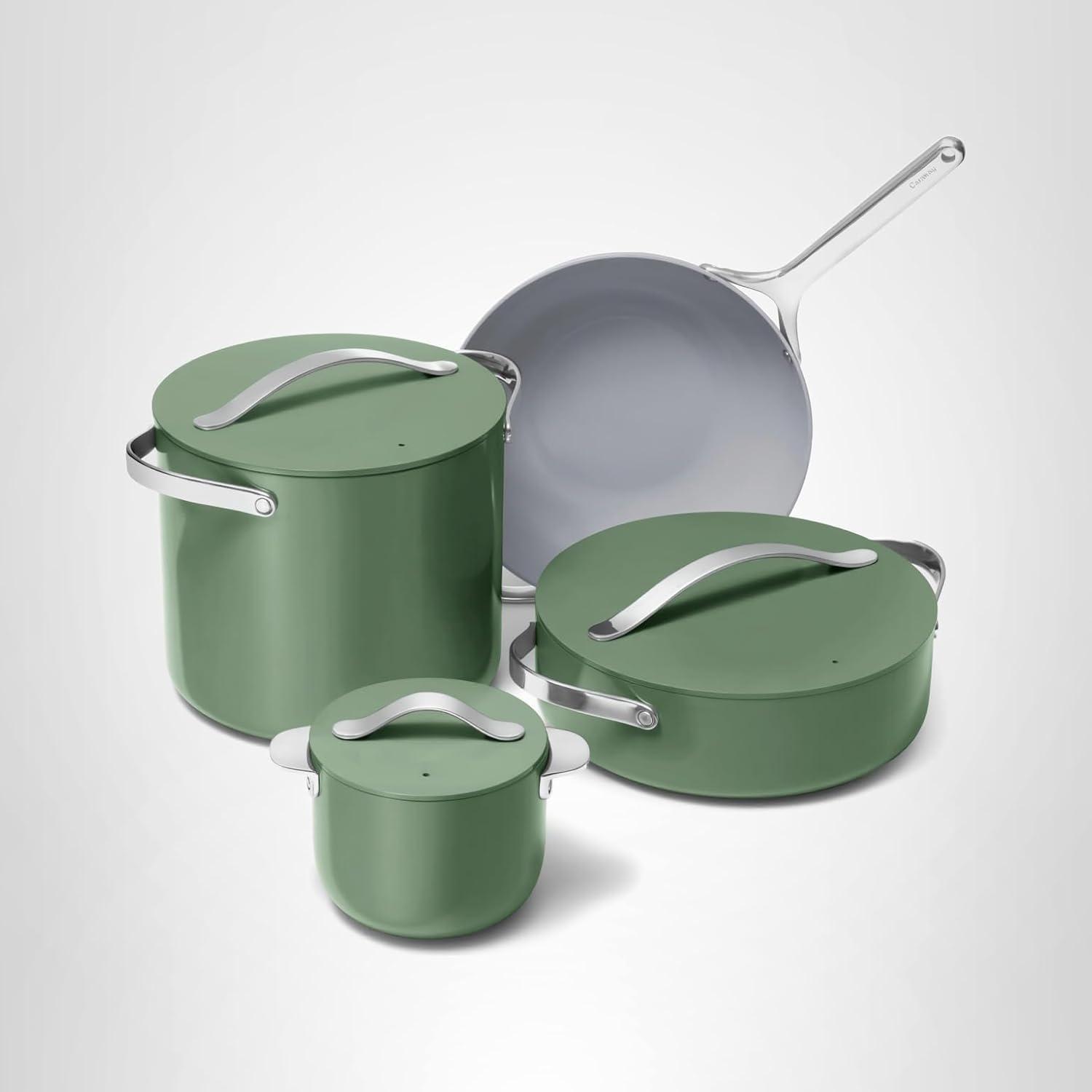 Caraway Cookware+ Collection – Specialty Cookware Set – Petite Cooker, Stir Fry Pan, Rondeau, & Stock Pot – 3 Lids & Storage Organizer Included – Cream(Sage)
