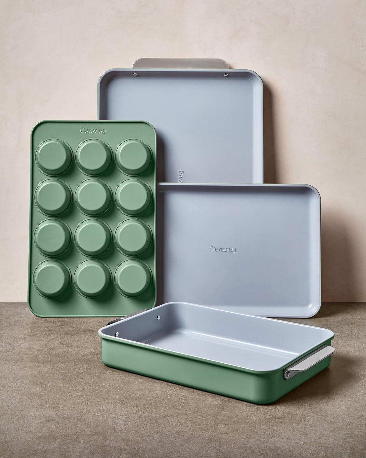 Caraway Nonstick Rectangle Baking Pan Set – 2x 9″ x 6.5″ & 1x 9″ x 13″ – Non-Toxic, PTFE & PFOA Free – Aluminized Steel Core – Deep Ceramic Baking Pan for Casseroles, Lasagna & More – Cream(Sage)